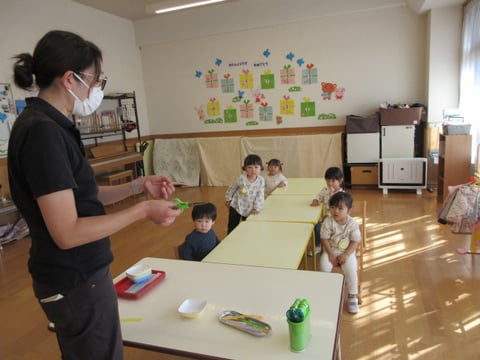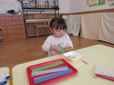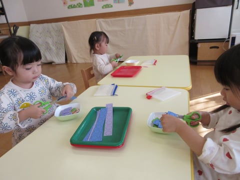 今日は、こひつじクラスで初めてはさみを使いました。