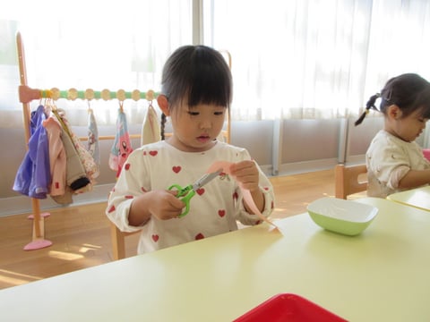 はさみの持ち方や、はさみの受け渡しの仕方の説明を聞いてから細長い紙を切る「切り落とし」に