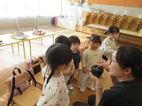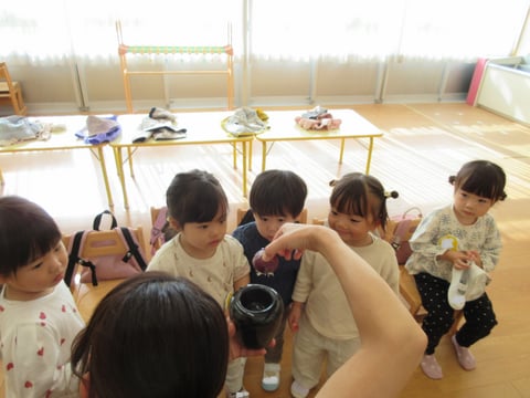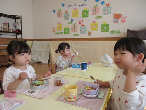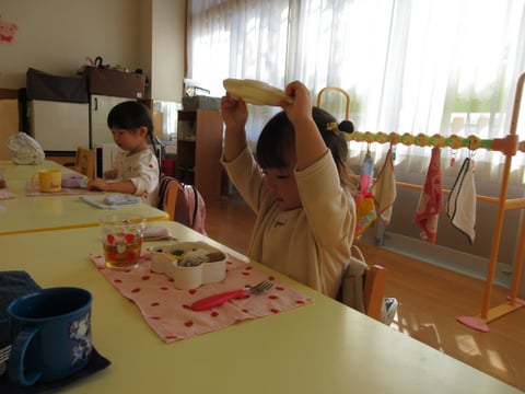 1階の年少さんは、今日はちゅうりっぷ組さんとすみれ組さんが2クラス一緒にお弁当をいただくようです。