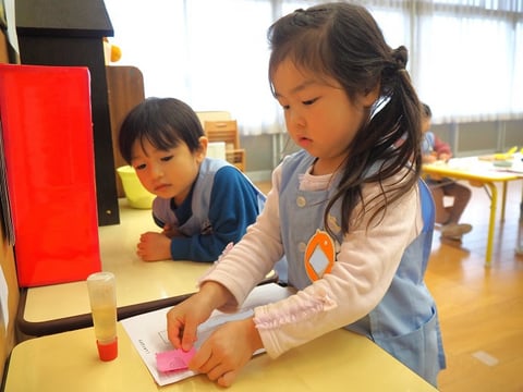 白百合幼稚園ではモンテッソーリ教育活動のひとつとして『お手紙ごっこ』を行っています。小中大組では2月上旬から始まっており、大組(年長)と中組(年中)は住所もメッセージも全て自分で書き、小組(年少)は住所はなぞり文字、メッセージは絵で描いています。
