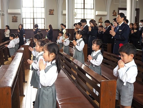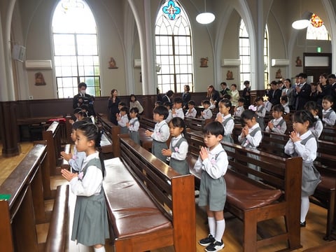 卒園児代表の6人のお友だちが先唱する形で、全員で感謝の祈りを捧げました。