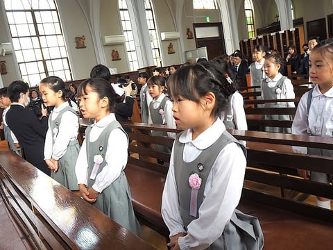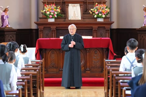 園長先生からのメッセージと、神父さまからは“これまでしてきた「世界中の人々をお守りください」のお祈りを忘れないでくださいね”とお話がありました。
