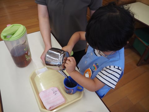 お弁当の時間になりました。自分のお茶を注ぎます。