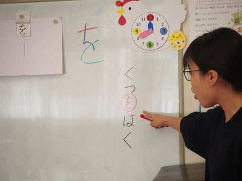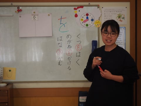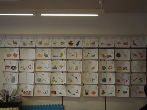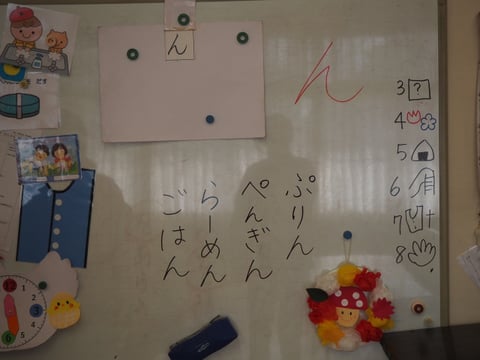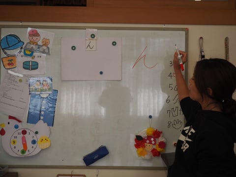 はてな(?)君と一緒に覚え始めた「ひらがな」ですが、今日が最後になりました。今日は「を」「ん」を先生から教えてもらいました。