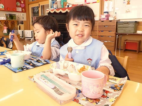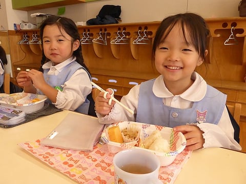 年中・年長さんは、お弁当に向き合うだけでなく、お友だちと楽しくお話をしながら、でも決められた時間内に食べ終えることを意識してお弁当の時間を過ごします。