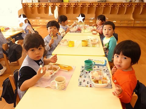 年少になると、お箸に挑戦する子が増えているようです。お残しをすることもありますが、作ってくださる方たちに感謝するきもちを大切にしようと、がんばる姿が見られました。