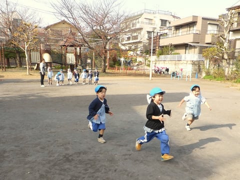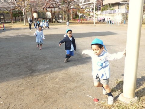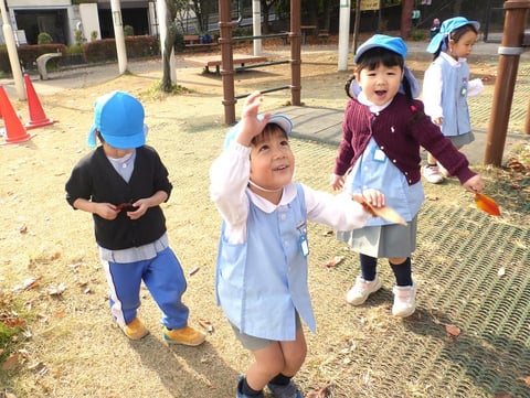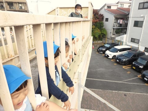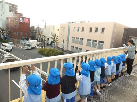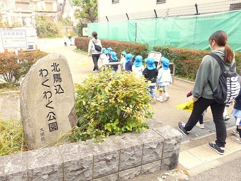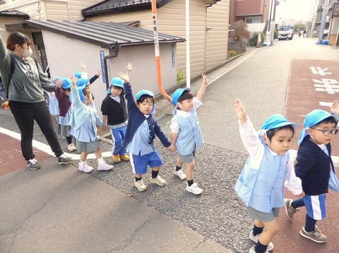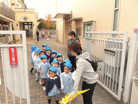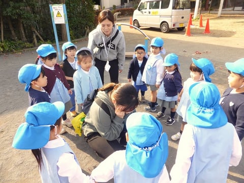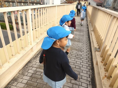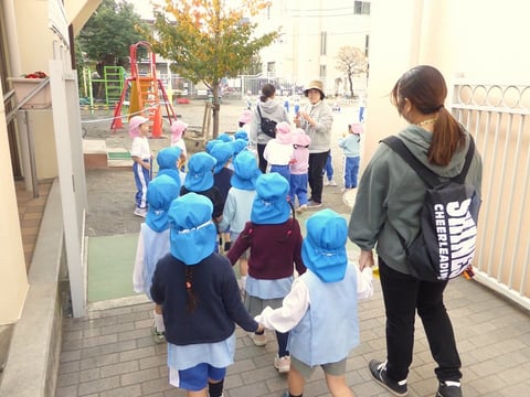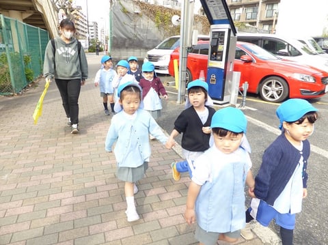 今日、すみれ組さん(年少)はお散歩に出かけました。