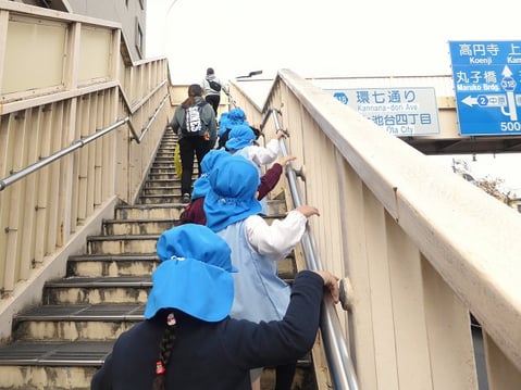 階段の上り下りをするときはしっかり手すりを握り、お友だちとの間も取りながら一段ずつ進みます。