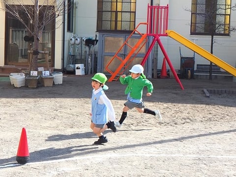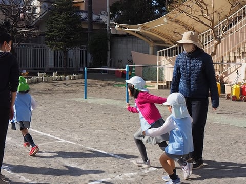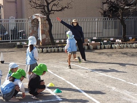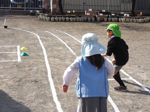 これまでも、自由遊びの時間などに、しばしば大組さんと一緒にリレーごっこをする姿が見られましたが、今日はすずらん組(年中・年長)のみんなでリレーごっこをすることになりました。
