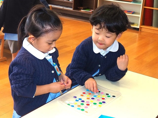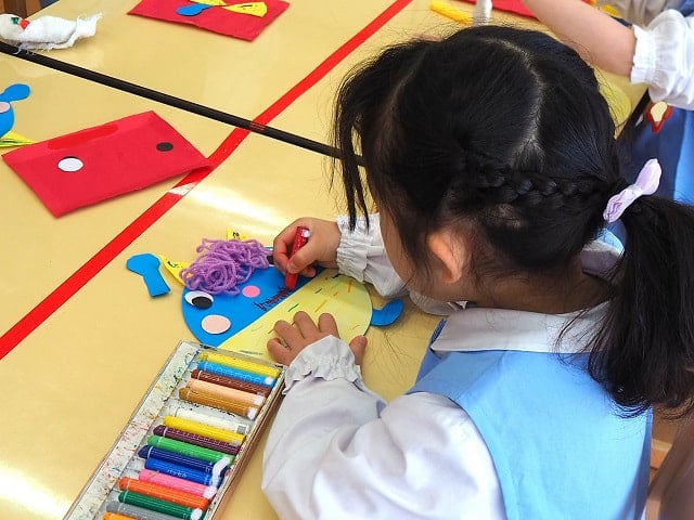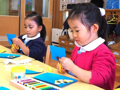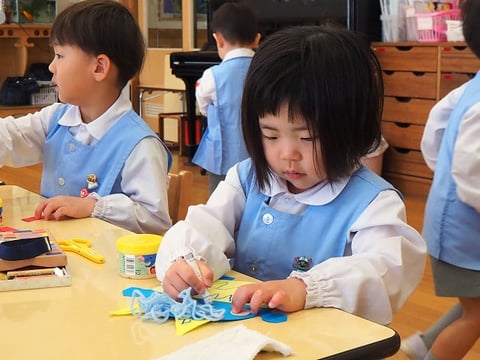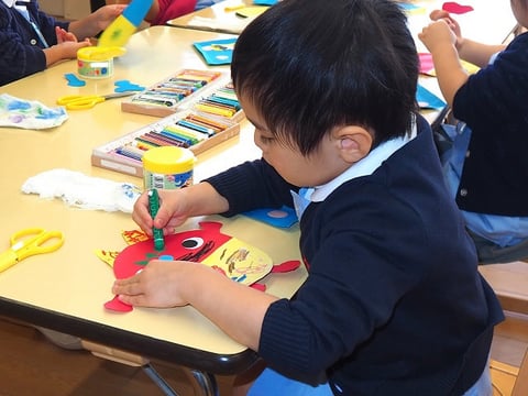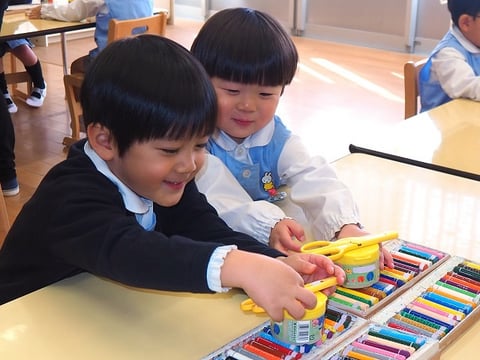 クレヨンは同じ机のお友だちとピッタンコ。今日はのりとはさみも使います。