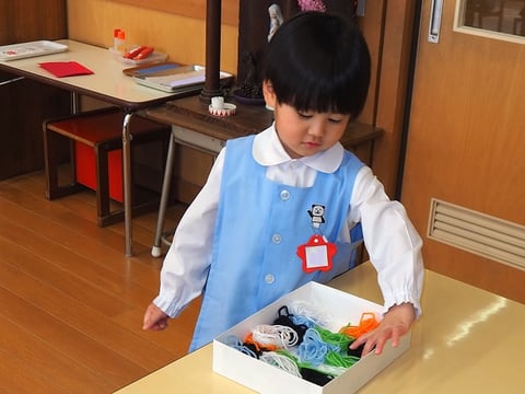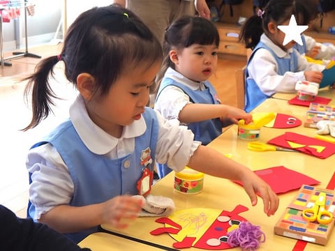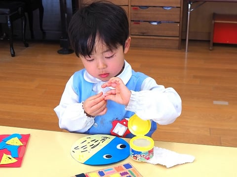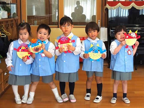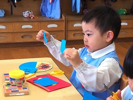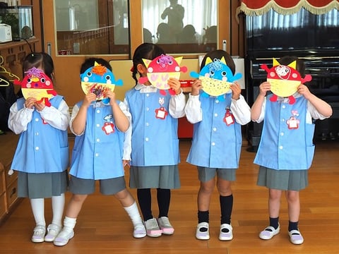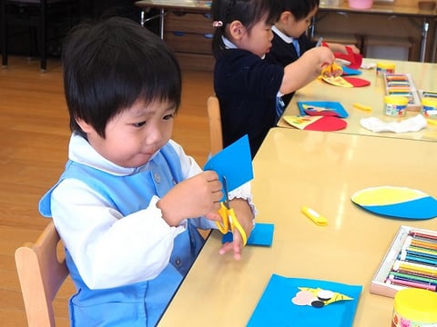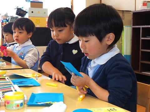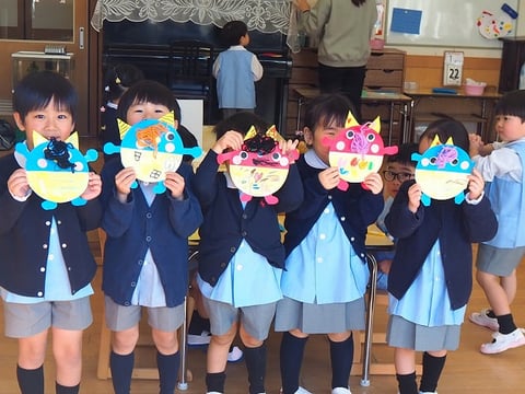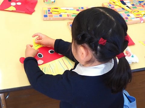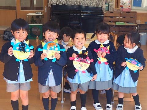 先日、中大組さん(年中・年長)の節分制作をご紹介しましたので、今日は小組さん(年少)の制作の様子をご紹介します。