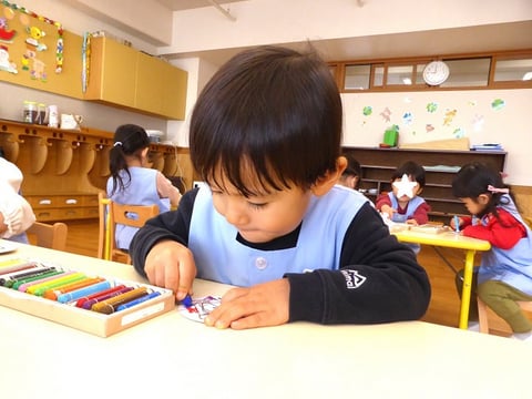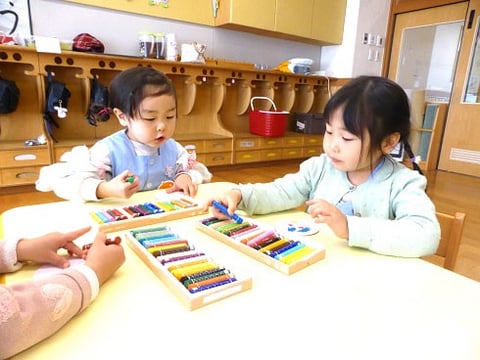 円柱差しの提示はこれまでにもしたことがありますが、白百合幼稚園の満3歳組は、少しずつメンバーが増えていくため、今回改めて提示をしました。『円柱差し』は、たくさんある感覚教具の中でも、子どもたちが一番初めに出会う教具に位置づけられており、繰り返し取り組むことによって観察する力/理論的に考える力/大きさを見分ける力が育まれ、"書く”動きの基礎作りともなります。対象年齢も2歳半~4歳なので、満3歳組の子どもたちにとってとても興味をもちやすい教具と言えます。