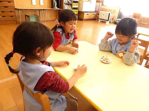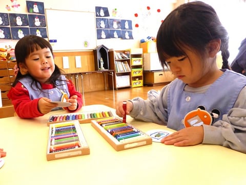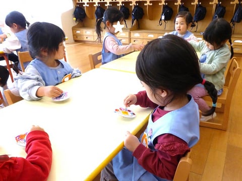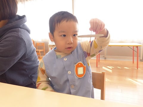 実生活の中でもたくさん3本指でつまむ経験をしている子どもたちなので、より指先の使い方を洗練させることができる活動で、楽しめることはないかなということで行ったのがコマ作り。つまむに加えてねじるという動きも加わるため少し難しいかもしれないとも思いつつ、挑戦してみることにしました。