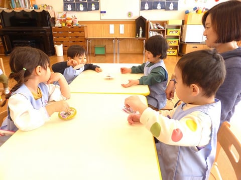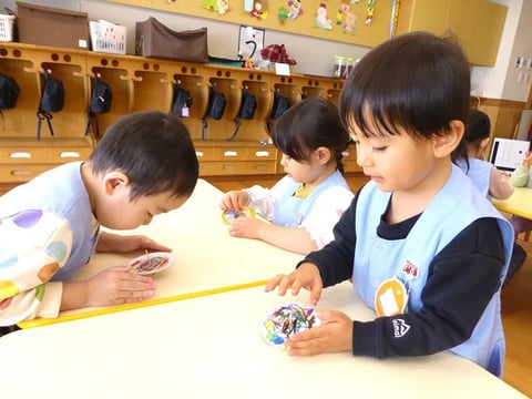 今日はゆり組さん(満3歳)とコマ作りをしました。