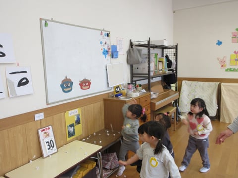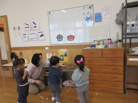 紙芝居を観て、「鬼は、病気や災害のこと」ということを知りました。今年一年、病気や災害など嫌なことが起きないことを願って、ホワイトボードに貼った赤鬼・青鬼に紙で作ったお豆を投げました。