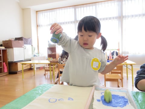 ピーマンと小松菜を切ってからスタンプにします。お野菜の断面の形が面白くてたくさんスタンプしました。