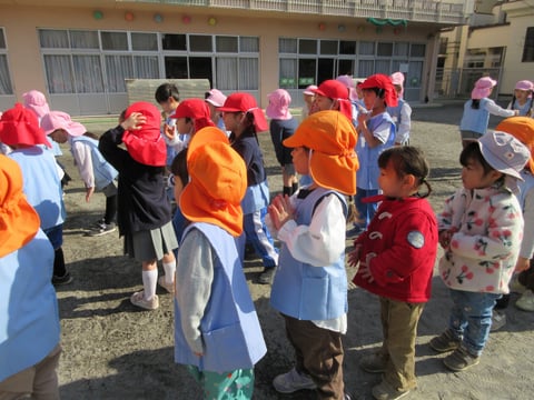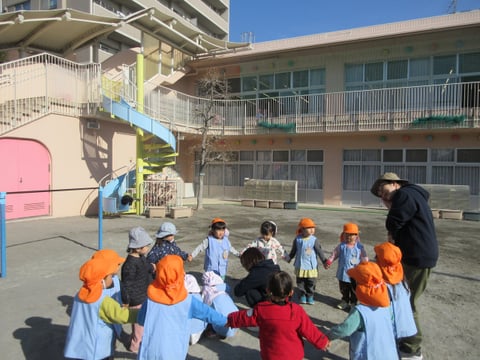体操の後はゆり組さん(満3歳児クラス)と一緒に「むっくりくまさん」という鬼ごっこをしました。みんなの輪の中のくまさんが「むっくりくまさん♪」の歌が終わると追いかけてくる鬼ごっこです。2学期に一度やったのを覚えていて、鬼も逃げるお友だちも一生懸命走って楽しんでいました。