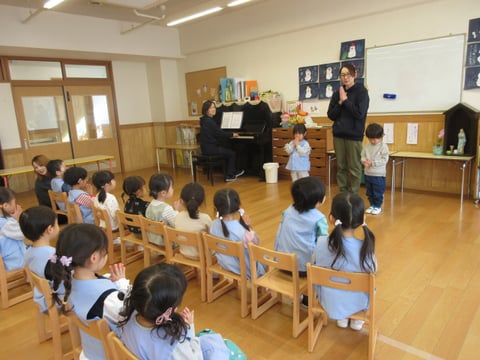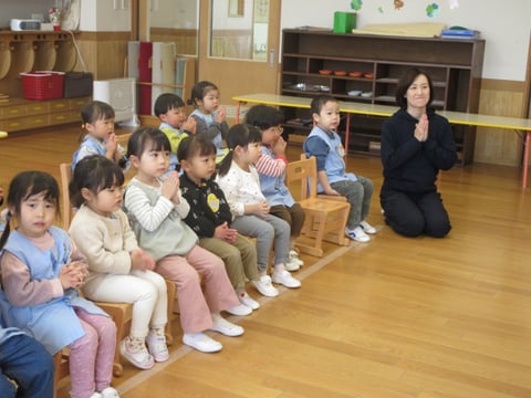 今日の朝の会は、2階にあるゆり組さんで一緒にしました。