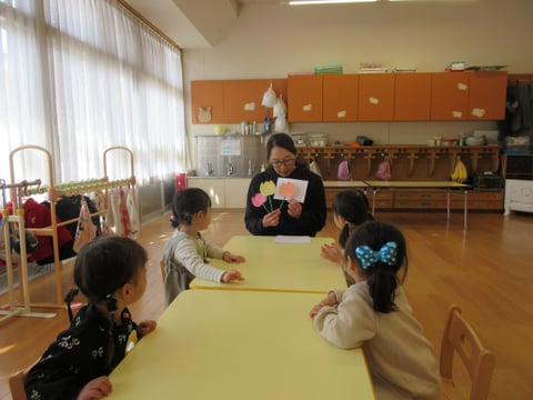 主活動はチューリップ作りです。それぞれ、好きな色のチューリップを3本作ることにしました。
