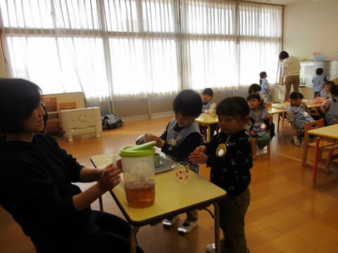 今日はこの後、こひつじクラスに戻って活動をする予定でしたが、ゆり組さんから「お弁当も一緒に食べようよ!」と誘ってもらったので、一度こひつじさんに戻って主活動をしてから、お弁当の時間に戻ってくることにしました。ゆり組さんに誘ってもらってとても嬉しそうなこひつじさんでした。
