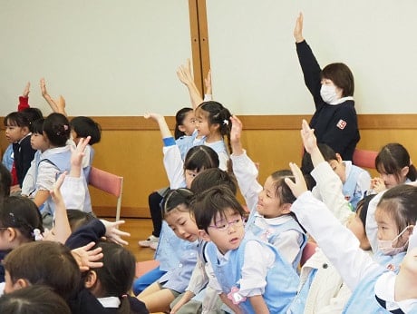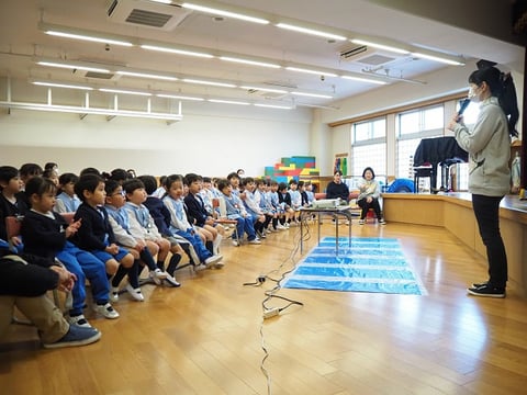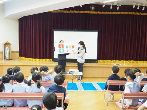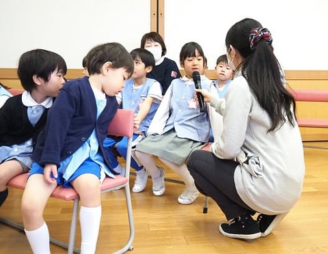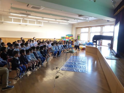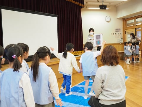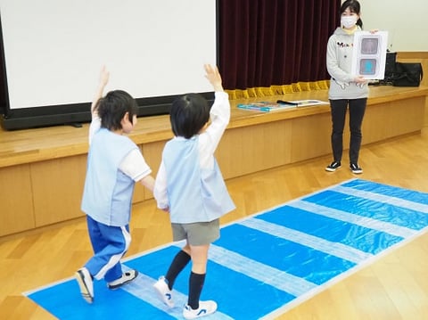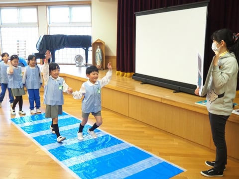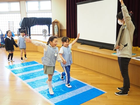 大組さんは4月から小学生。小学生になってしばらくしたら、自分だけで道を歩いて学校に行くことになります。なんとなくは知っている交通ルールをきちんと確認し、実践できるようにするために、そして、交通安全について自分でも考えるきっかけになるようにとプログラムは進みます。