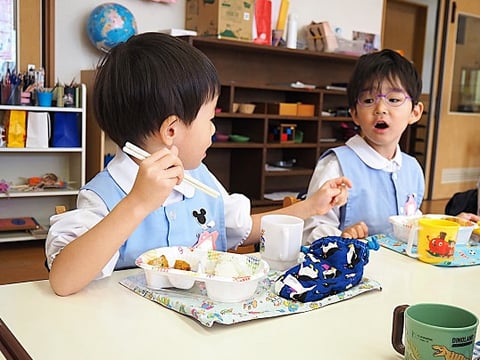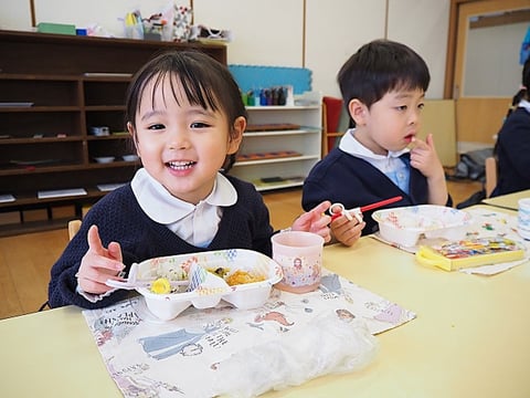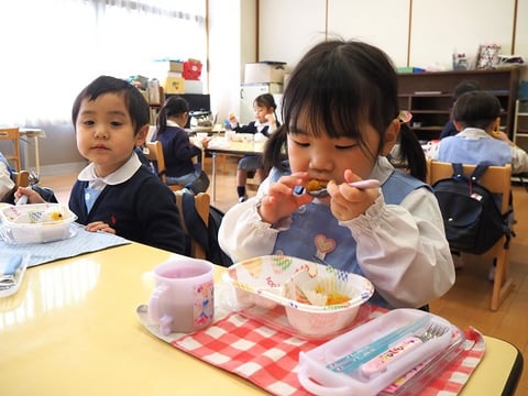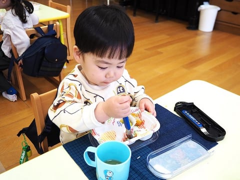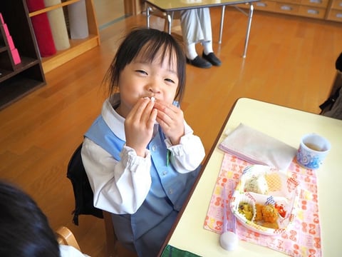 今日が初めてのお弁当給食だったお友だちも、自分でパクパクと食べていました。