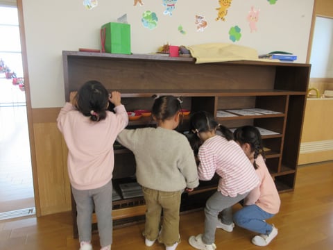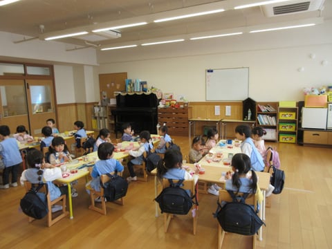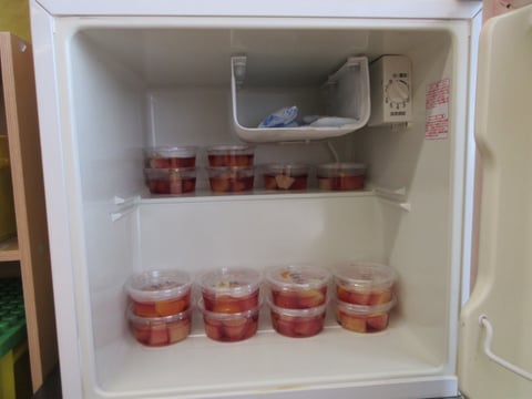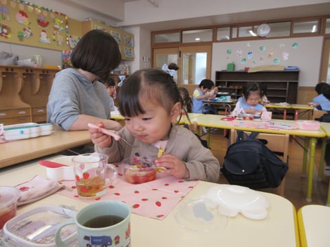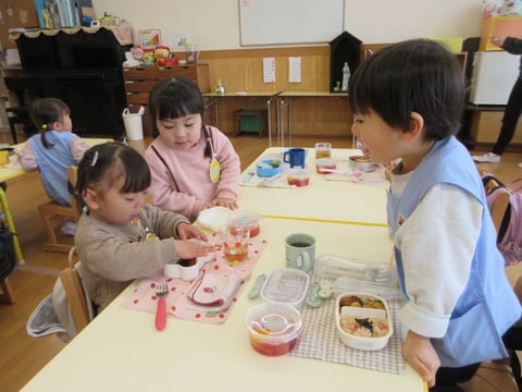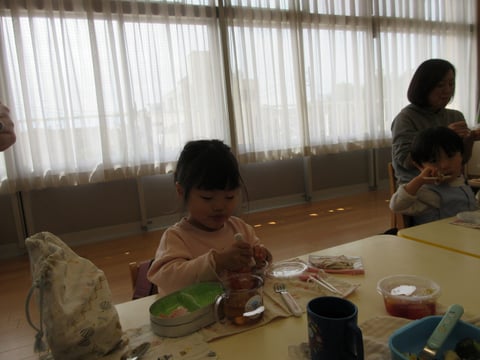 今日はお弁当も、ゆり組さんのお部屋で食べました。みんな、「ゼリー固まったかな」とうきうきしながらお弁当の準備をしていました。