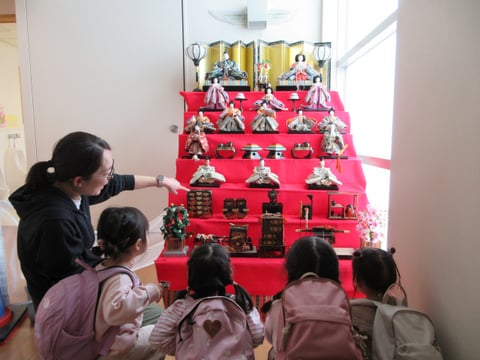 お部屋に戻る途中、お雛様見学をしました。七段飾りは観るものがたくさんあって大興奮でした。