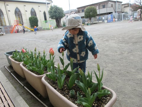 今日は、朝の会の後にお外遊びにいきました。