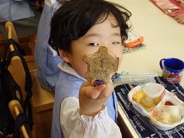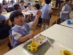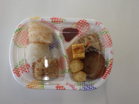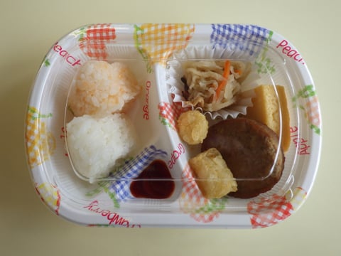 毎週月曜日はお弁当給食日です。みんなと同じお昼ご飯を、みんなと一緒に食べることによって、仲間意識を育むとともに、苦手なものでも頑張って食べようという気持ちも育ってきます。今日のメニューは、おむすびとハンバーグ、それにポテトと切り干し大根でした。